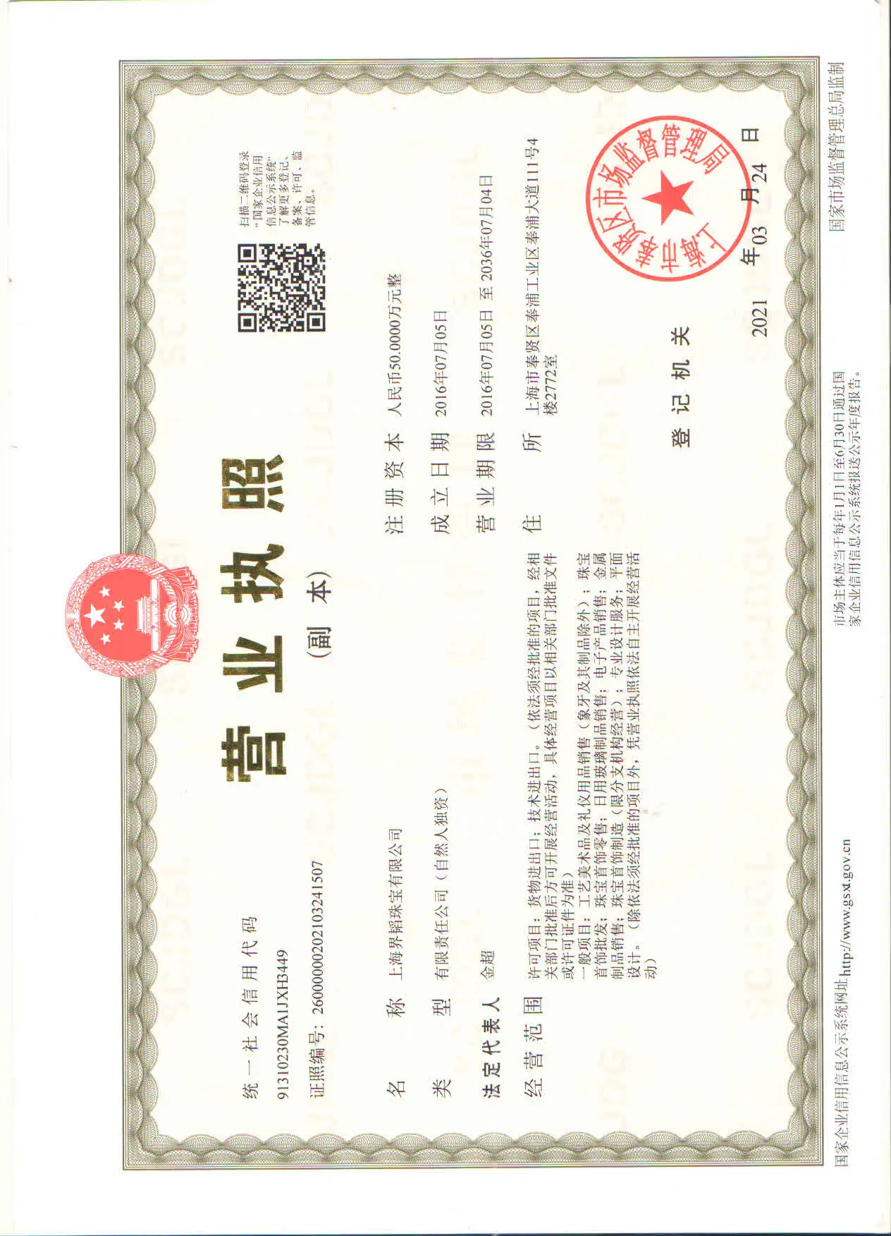 Registered address : Room 2772, 4th Floor, No. 111 Fengpu Avenue, Fengpu Industrial Zone Shanghai China